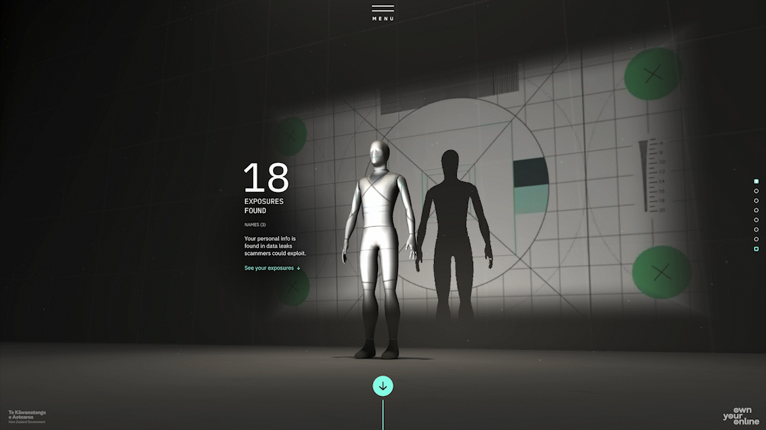 Over 4.3 million New Zealand account details are exposed to scammers. Yet when it comes to cyber crime, most of us don’t feel vulnerable. Because the stakes don’t feel personal.‘How Exposed Am I?’ is a digital tool designed to get under your skin. Analysing your own digital footprint against a growing dataset of more than 73 billion leaked data points in real time. Presenting every user’s online presence as an intimate, unsettling look into what scammers could have access to – and a hyper-personalised case for why their own online security is important.Educational, engaging, emotive, the tool connected with a previously disengaged audience. Breaking industry standards for time spent on site, and for engaged interactions. The tool is now being used as an educational resource in universities, and has been praised and adopted by leading cyber security experts.